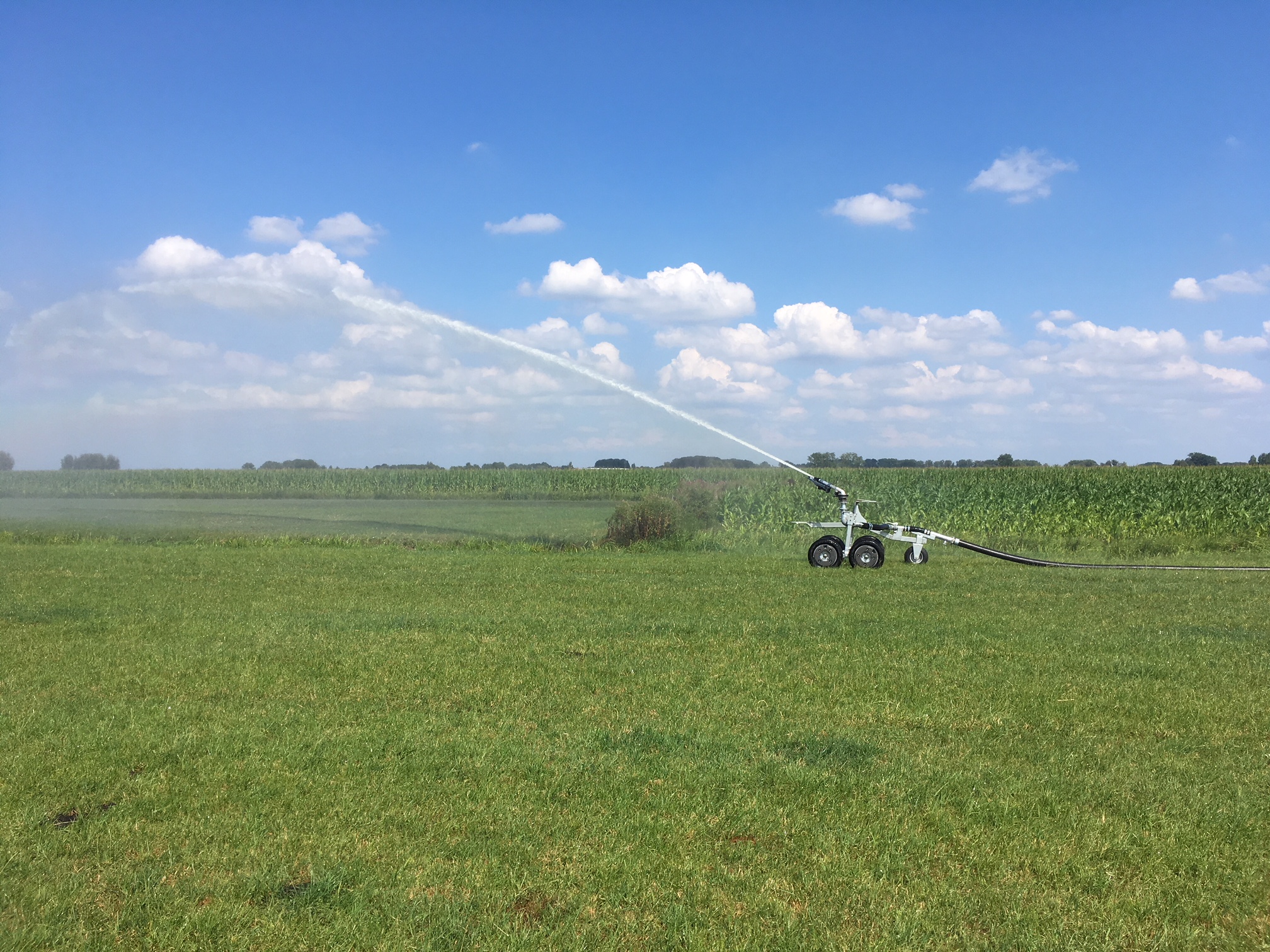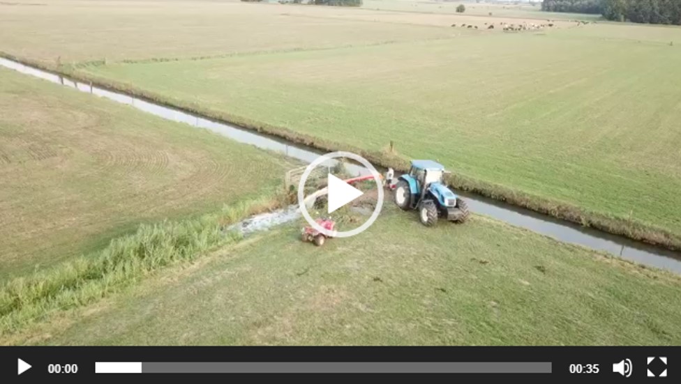 Geleverd: Irrifrance Optima 1032 beregeningshaspel met een 120/380 slang. Deze combinatie word gevoed door een Rovatti pomp op een degelijke bok met hydraulische zuigarm en vulvat.