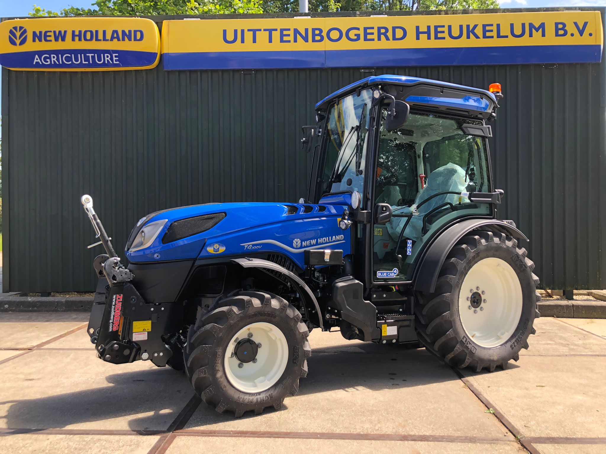 NEW HOLLAND T4.100V VOOR FRUITTELER Dit nieuwe model is uitgevoerd met een Stage V motor en uitgerust met een Zuidberg fronthef en frontaftakas, elektrische ventielen en een geveerde vooras. De BLUE CAB™ 4 zorgt voor een gezonde luchtkwaliteit in de cabine. Succes met deze complete tractor!