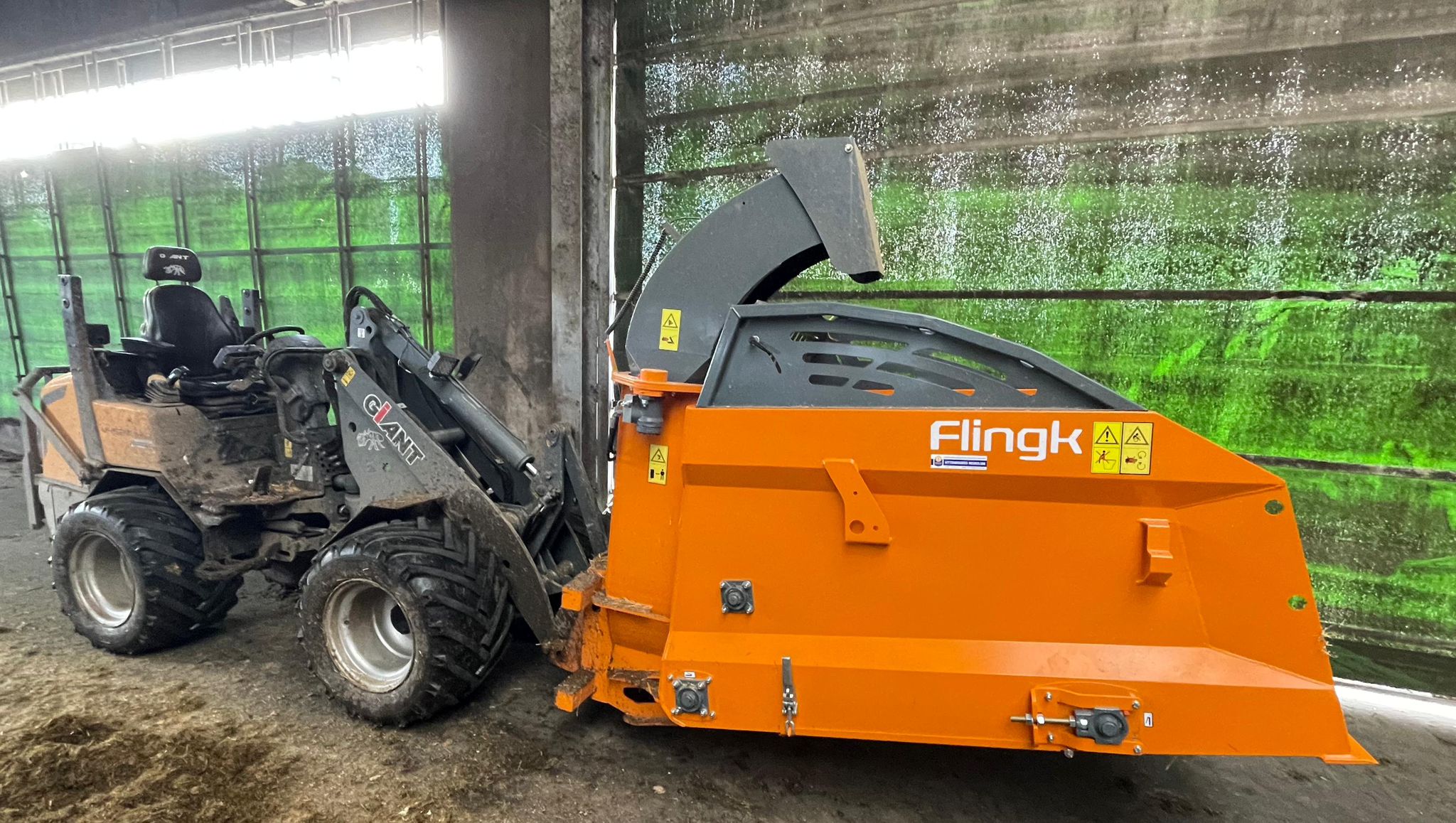 Deze Flingk SHC1450R stroblazer voor aan de Giant shovel is draadloos bedienbaar vanuit de cabine. De machine heeft een blaaspijp waarvan de instrooidiepte vanuit de cabine geregeld kan worden en welke kan draaien voor snel en flexibel werken.
